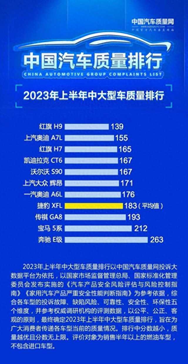 作为德系豪华品牌的带头大哥,奔驰E的表现确实让人大跌眼镜。在2023年上半年中大型车质量排行榜中,就连在网络中被吐槽修不好的捷豹XFL,都拿到了183的平均及格成绩,奔驰E作为畅销的中大型豪华轿车,竟然只得到了个263的综合评价,远高于质量平均线,处于垫底水平。