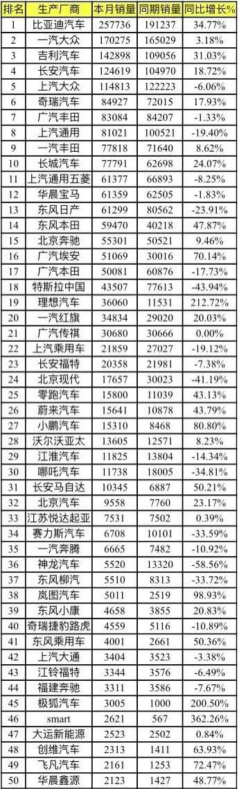 - 汽车自主品牌销量洗牌,比亚迪、上汽、吉利、奇瑞、长安排名前5