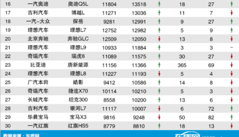 再来看看榜单的第21名到30名,理想L9的投诉量为3宗,与8月份持平,而瑞虎8、理想L8、本田皓影、捷途X70、坦克300和红旗HS5这6款SUV,它们在9月份的投诉量都是呈下降趋势的,短期口碑值得肯定。而银河L7和宝马X3这两款车型的投诉量较8月份有小幅增长。