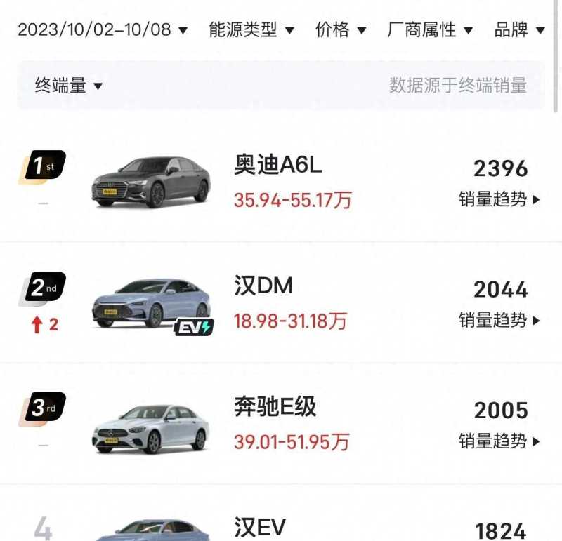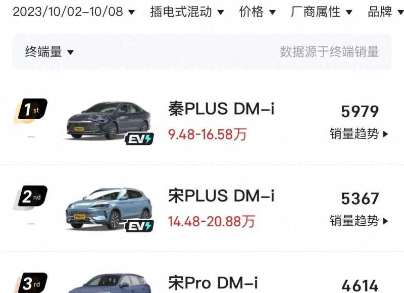 它提供401km和420km两种续航版本,在懂车帝平台的新能源车型周销量排行榜上排名第二,单周销量为6997辆。海豚将时尚、高效和实用融为一体,拥有出色的外观设计和续航能力,成为了消费者心中的首选。秦PLUS DM-i是一款紧凑型轿车,共有6款在售车型,指导价区间为9.98万-16.58万,全系标配1.5L插电式混合动力。在懂车帝平台的新能源车型周销量排行榜上,秦PLUS DM-i排名第一,单周销量为5979辆。
