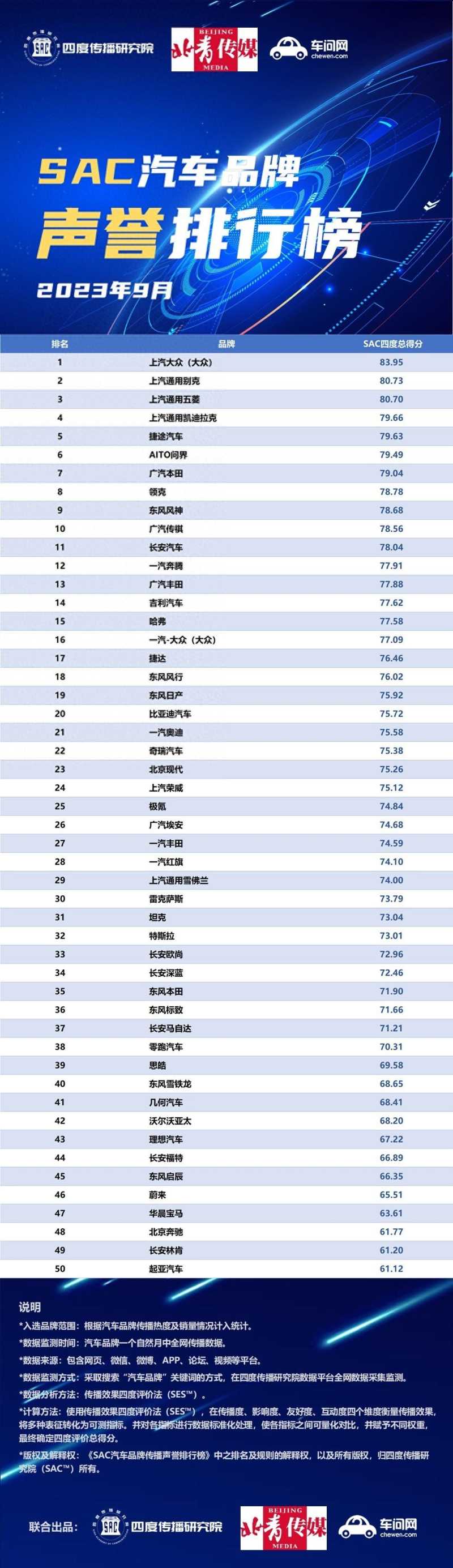 近日,四度传播研究院(SAC™)联合北青传媒、车问网,正式发布了2023年9月份共50个汽车品牌的声誉排行榜。从本月的汽车品牌声誉排行榜来看,上汽大众(大众)品牌排名第一,上汽通用别克和上汽通用五菱9月分列第二、三名。此外,起亚汽车9月排名垫底。