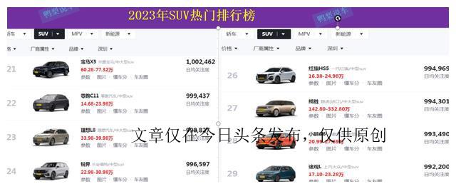 SUV(Sport Utility Vehicle),正如其名,已成为汽车市场的明星。在当今的汽车市场,SUV们不仅仅是实用的代名词,更是广受欢迎的汽车类型。本文将探讨2023年SUV热门排行榜,这一排行榜的数据来源是“懂车帝”。