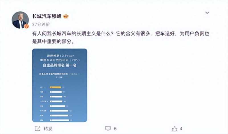 今日,长城汽车总裁穆峰在其微博账号发布了令人振奋的消息,庆祝旗下品牌魏派在中国自主品牌车辆可靠性研究中夺得了第一名的殊荣。这一排名由全球知名的消费者洞察与市场研究机构J.D. Power发布,着实让人瞩目。