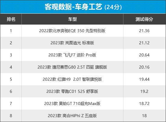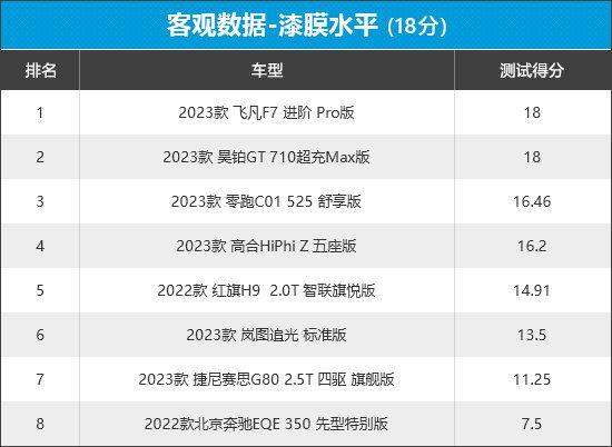 从榜单中可以看出,飞凡F7和昊铂GT这两款车型在此环节拿到了满分,整车的漆膜厚度和喷涂均匀性表现可圈可点。令人有些意外的是,在车身工艺测试环节表现出色的北京奔驰EQE阴沟里翻船,有9个关键部位的漆膜厚度均值低于90μm,得分与另外七款车型差距较大,排名垫底,有失豪华品牌身份。
