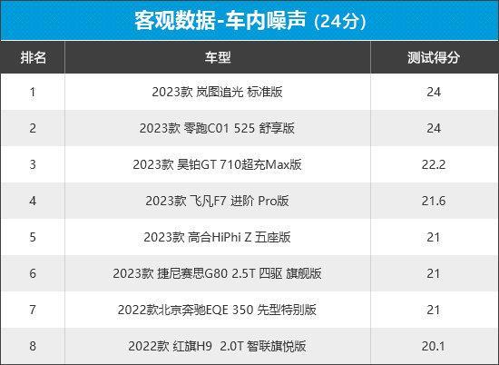 从榜单排名来看,红旗H9在车内噪声测试部分失分较多,导致其排名再次垫底。相比之下,其余七款车型在车内噪声测试部分成绩非常接近,差距主要体现在空调噪声测试部分。其中,岚图追光和零跑C01以满分成绩领跑,车内噪声和空调噪声表现都值得肯定。