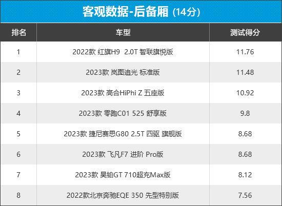 从榜单排名来看,红旗H9再一次荣登榜首,其在后备厢开口面积测试项目中拿到了满分,从而得分领先于其他七款车型。相比之下,北京奔驰EQE在本轮测试中位居倒数第一,其在后备厢开口面积和后备厢最小宽度两个测试项目中失分较多。