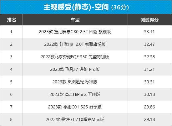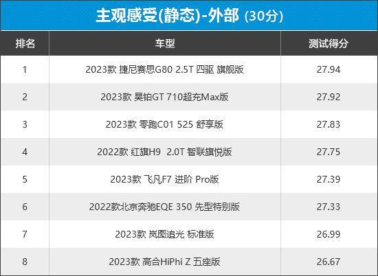 从榜单排名可以看出,八款车型在外部的主观评价中得分差距很小,捷尼赛思G80以微弱的优势拔得头筹。排名末尾的高合HiPhi Z失分的主要原因在于未配备手动钥匙,缺少紧急状况下的应急手段。