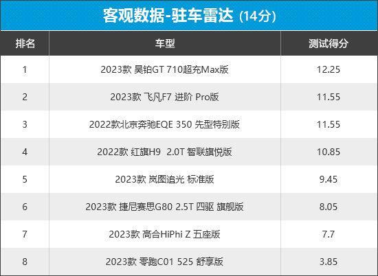 从榜单排名可以看出,各车型之间的得分存在较大差异,昊铂GT整体表现最佳,排名榜单首位。零跑C01排名垫底,且得分与其他车型差距较大,主要原因在于前驻车雷达的缺失,以及倒车时后驻车雷达持续蜂鸣阶段车尾与障碍物距离过近,存在碰撞风险。
