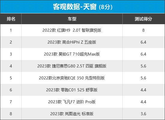从榜单排名来看,红旗H9表现突出,以满分的成绩再次夺冠,整体表现明显好于其他七款车型。岚图追光在本轮测试中排名垫底,其天窗面积占比表现尚可,但天窗无法开启导致得分被拉低。