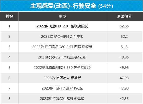 从榜单排名可以看出,红旗H9再次展现出高端车型的实力,不难看出,其更加重视与日常用车息息相关的安全和驾驶感受。零跑C01由于在盲区监测维度中的表现欠佳,导致失分较多,排名榜单末尾,其余三个测试项目的表现中规中矩。