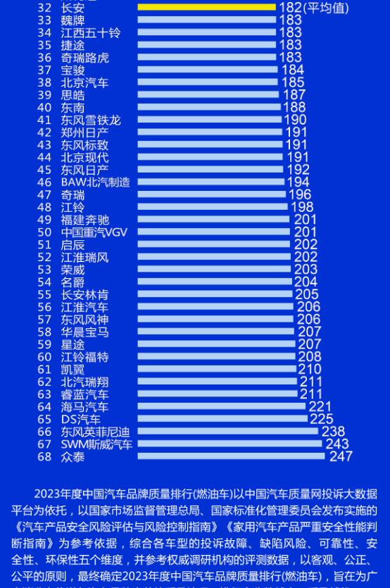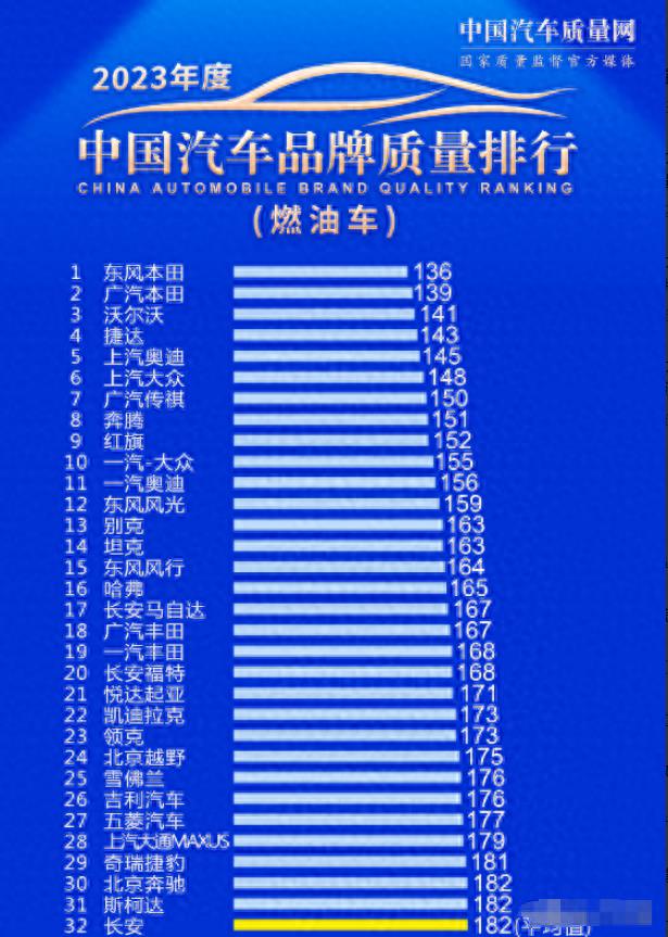 真惨,2023年度汽车品牌质量排行,本田第1,奇瑞第47,星途倒数