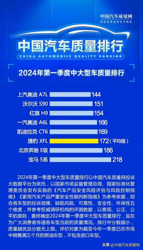 2024年第一季度中大型车质量排行以中国汽车质量网投诉大数据平台为依托,以国家市场监督管理总局、国家标准化管理委员会发布实施的《汽车产品安全风险评估与风险控制指南》《家用汽车产品严重安全性能判断指南》为参考依据,综合各车型的投诉故障、缺陷风险、可靠性、安全性、环保性五个维度,并参考权威调研机构的评测数据,以客观、公正、公平的原则,最终确定2024年第一季度中大型车质量排行,旨在为广大消费者传递各车型当前的质量情况。排行中分数越小,质量越优且分数无上限。评价对象为截至今年一季度已在市场中销售满三个月的燃油车型,不包含进口车型。
