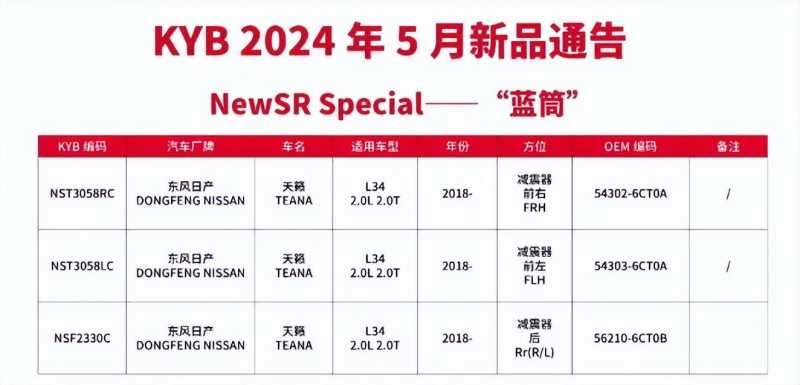 KYB品牌在全球的覆盖范围广大,在中国所涉及的行业也非常广泛,是行业中名副其实的“全球减震专家”,产品覆盖全球主要车系品牌,产品线全面满足原厂配套(OE),维修、四驱、运动型市场需求。本月推出新品如下:
