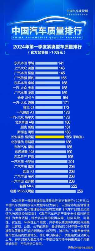 2024年第一季度紧凑型车质量排行(官方起售价>10万元)以中国汽车质量网投诉大数据平台为依托,以国家市场监督管理总局、国家标准化管理委员会发布实施的《汽车产品安全风险评估与风险控制指南》《家用汽车产品严重安全性能判断指南》为参考依据,综合各车型的投诉故障、缺陷风险、可靠性、安全性、环保性五个维度,并参考权威调研机构的评测数据,以客观、公正、公平的原则,最终确定2024年第一季度紧凑型车质量排行(官方起售价>10万元),旨在为广大消费者传递各车型当前的质量情况。排行中分数越小,质量越优且分数无上限。评价对象为截至今年一季度已在市场中销售满三个月的燃油车型,不包含进口车型。