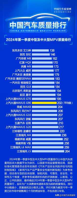 2024年第一季度中型及中大型MPV质量排行以中国汽车质量网投诉大数据平台为依托,以国家市场监督管理总局、国家标准化管理委员会发布实施的《汽车产品安全风险评估与风险控制指南》《家用汽车产品严重安全性能判断指南》为参考依据,综合各车型的投诉故障、缺陷风险、可靠性、安全性、环保性五个维度,并参考权威调研机构的评测数据,以客观、公正、公平的原则,最终确定2024年第一季度中型及中大型MPV质量排行,旨在为广大消费者传递各车型当前的质量情况。排行中分数越小,质量越优且分数无上限。评价对象为截至今年一季度已在市场中销售满三个月的燃油车型,不包含进口车型。