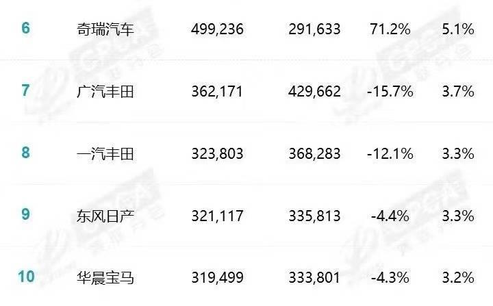 榜单中的最后一个大变化是,奇瑞凭借增长逾七成,总销量近50万辆的好成绩,由第八升至第六,市场份额由去年的3.7%增至5.1%。