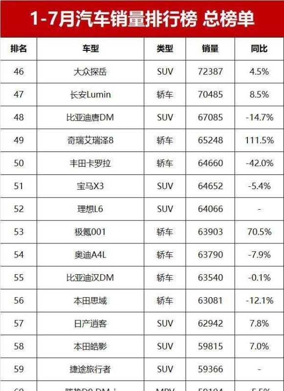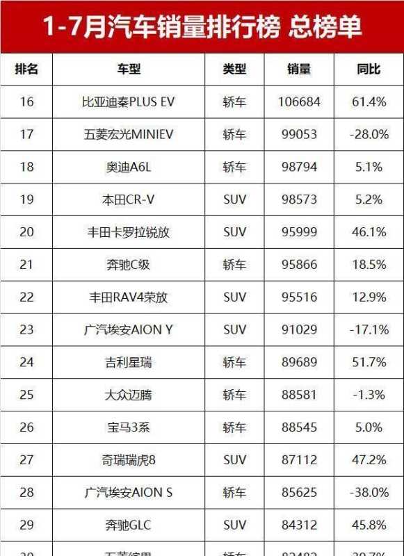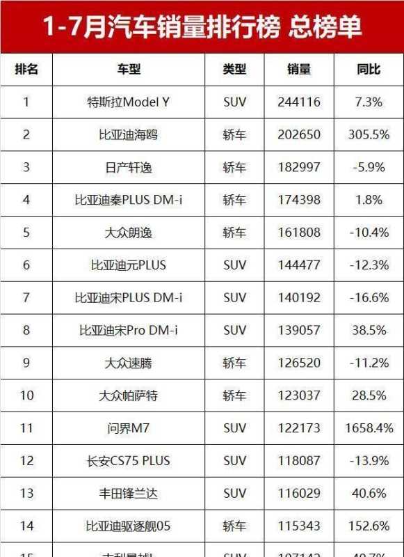 1-7月汽车销量排行榜总榜单!第1-658名,你的爱车排第几?