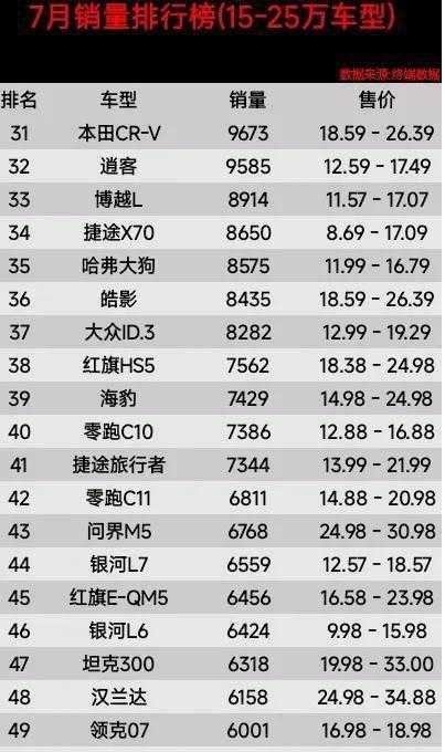 15万-25万车别乱买,7月销量榜,理想L6第4、汉仅排第9名