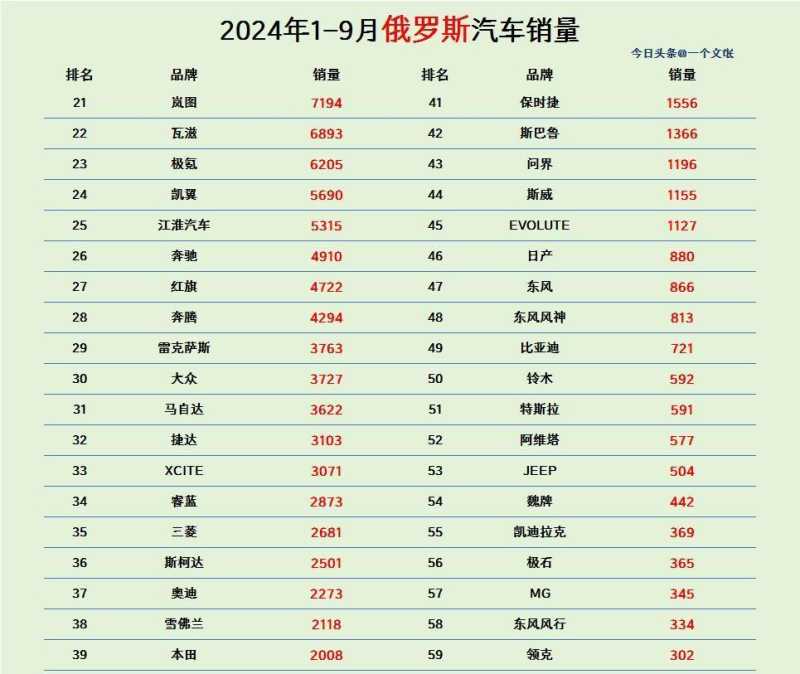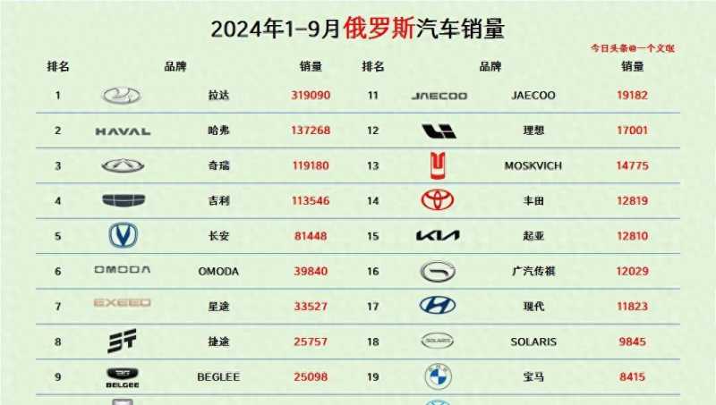 太强了,俄罗斯1-9月汽车销量榜,奇瑞第3,理想第11,比亚迪第49