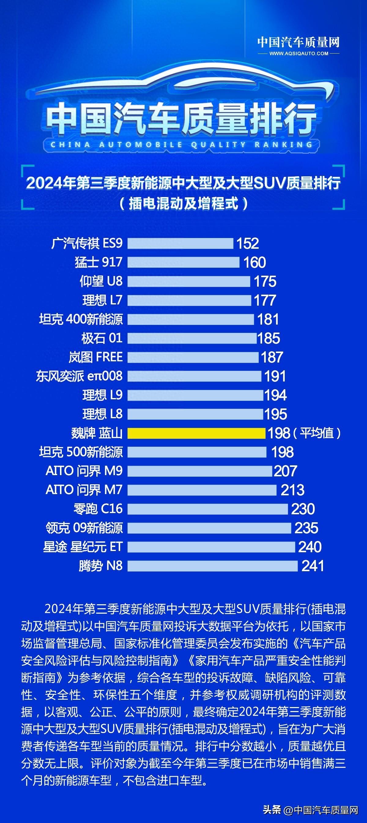 2024年第三季度新能源中大型及大型SUV质量排行(插电混动及增程式)以中国汽车质量网投诉大数据平台为依托,以国家市场监督管理总局、国家标准化管理委员会发布实施的《汽车产品安全风险评估与风险控制指南》《家用汽车产品严重安全性能判断指南》为参考依据,综合各车型的投诉故障、缺陷风险、可靠性、安全性、环保性五个维度,并参考权威调研机构的评测数据,以客观、公正、公平的原则,最终确定2024年第三季度新能源中大型及大型SUV质量排行(插电混动及增程式),旨在为广大消费者传递各车型当前的质量情况。排行中分数越小,质量越优且分数无上限。评价对象为截至今年第三季度已在市场中销售满三个月的新能源车型,不包含进口车型。