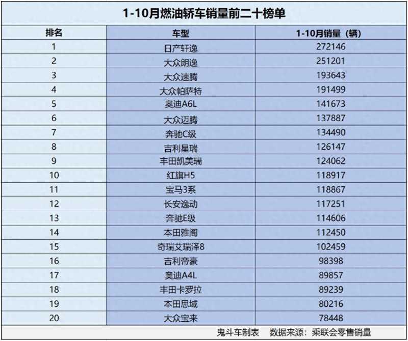 燃油车跌惨了?1-10月燃油轿车销量榜单 15款过十万 朗逸第二