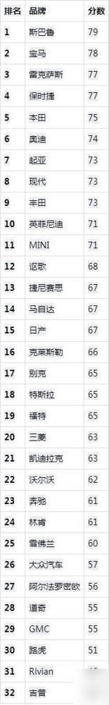 排在前十名的汽车品牌分别是斯巴鲁、宝马、雷克萨斯、讴歌、现代、起亚、保时捷、奥迪、大众、通用,斯巴鲁在榜首的位置无人可撼动,宝马和雷克萨斯紧随其后。