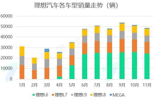 还好,理想的基本盘L系列血够厚,经过大半年的调整,算是缓过了这口气,销量也稳定在了月销5万的水平。12月,预计销量更是能达到6万左右。