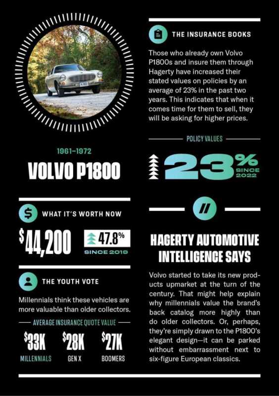 P1800长期以来一直是经典车型,深受古怪的沿海地区的人们的喜爱,而这些人传统上是沃尔沃的核心市场。然而,最近我们注意到越来越多的人开始了解沃尔沃的优点。根据我们的保险数据,千禧一代尤其对P1800表现出兴趣,而且往往愿意为它支付比老一代收藏家更高的价格。根据Hagerty价格指南,过去五年中,平均状况#2的汽车价值已经上涨了47.8%,达到44,200美元。我们打赌这种趋势会持续下去。事实上,我们很惊讶这款瑞典跑车花了这么长时间才流行起来。