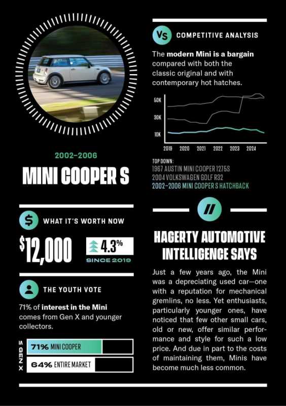从车顶翼、引擎盖进气口、中央出口双尖排气管、防滚架式内门板设计到方向盘上方的粗转速表(更不用说可选的赛车条纹和拉力赛灯),工厂里总是有一些男孩赛车手的乐趣,所以Hagerty为其提供保险的CooperS车主中超过70%是X世代或更年轻,这并不奇怪。许多人在现实生活中或各种屏幕上都是围绕这些汽车长大的,而利用这种怀旧情绪也不需要花费太多;根据Hagerty价格指南,即使是最好的(条件#1)样车也只卖16,000美元左右。(特别版的JohnCooperWorks车型拥有更强大的动力和更坚固的悬架,售价更高。)