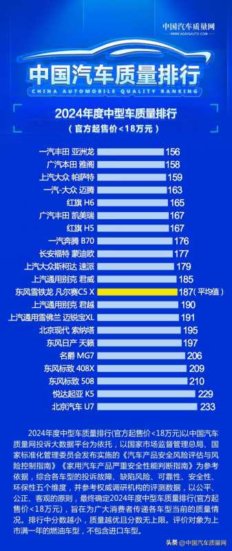 2024年度中型车质量排行(官方起售价<18万元)以中国汽车质量网投诉大数据平台为依托,以国家市场监督管理总局、国家标准化管理委员会发布实施的《汽车产品安全风险评估与风险控制指南》《家用汽车产品严重安全性能判断指南》为参考依据,综合各车型的投诉故障、缺陷风险、可靠性、安全性、环保性五个维度,并参考权威调研机构的评测数据,以客观、公正、公平的原则,最终确定2024年度中型车质量排行(官方起售价<18万元),旨在为广大消费者传递各车型当前的质量情况。排行中分数越小,质量越优且分数无上限。评价对象为上市满一年的燃油车型,不包含进口车型.