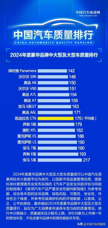 2024年度豪华品牌中大型及大型车质量排行以中国汽车质量网投诉大数据平台为依托,以国家市场监督管理总局、国家标准化管理委员会发布实施的《汽车产品安全风险评估与风险控制指南》《家用汽车产品严重安全性能判断指南》为参考依据,综合各车型的投诉故障、缺陷风险、可靠性、安全性、环保性五个维度,并参考权威调研机构的评测数据,以客观、公正、公平的原则,最终确定2024年度豪华品牌中大型及大型车质量排行,旨在为广大消费者传递各车型当前的质量情况。排行中分数越小,质量越优且分数无上限。评价对象为上市满一年的燃油车型,不包含豪华品牌中的高性能版本车型。