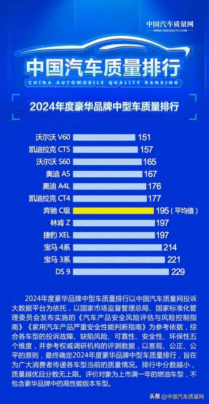 2024年度豪华品牌中型车质量排行以中国汽车质量网投诉大数据平台为依托,以国家市场监督管理总局、国家标准化管理委员会发布实施的《汽车产品安全风险评估与风险控制指南》《家用汽车产品严重安全性能判断指南》为参考依据,综合各车型的投诉故障、缺陷风险、可靠性、安全性、环保性五个维度,并参考权威调研机构的评测数据,以客观、公正、公平的原则,最终确定2024年度豪华品牌中型车质量排行,旨在为广大消费者传递各车型当前的质量情况。排行中分数越小,质量越优且分数无上限。评价对象为上市满一年的燃油车型,不包含豪华品牌中的高性能版本车型。