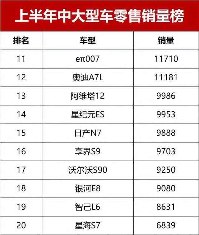 上半年中大型车零售销量排名!小米SU7断层领先,宝马5系仅第五!
