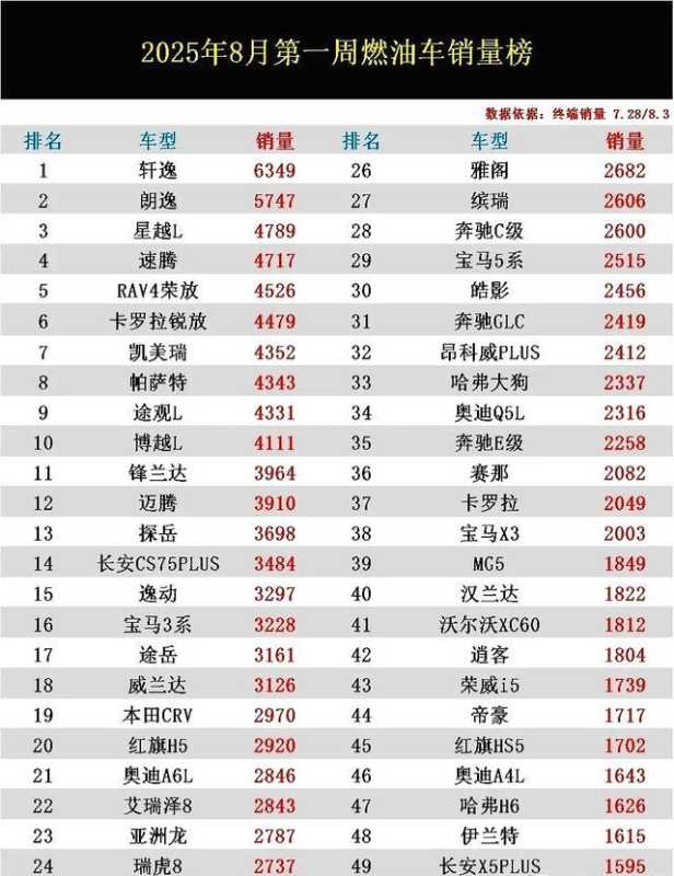 实现大胜!8月第一周燃油车销量排名:合资车霸榜,逸动无缘前十