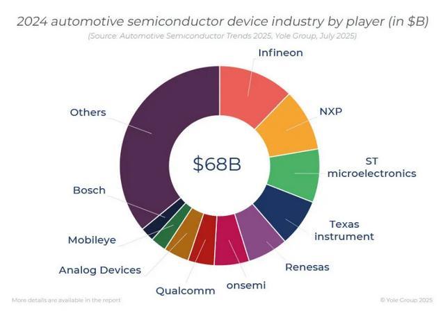 根据Yole的报告,德州仪器排名第四,瑞萨电子排名第五。Yole指出,这五家公司占据了汽车半导体市场约50%的份额,但也强调“新的挑战者正在迅速增强影响力”。