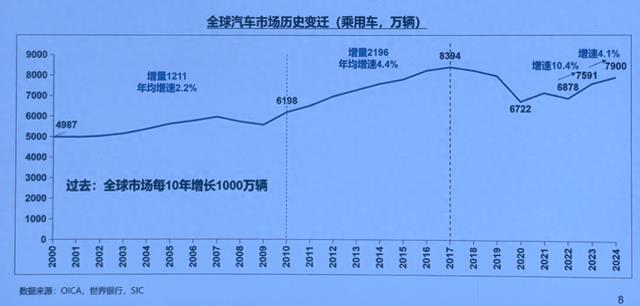 据介绍,2000年,全球乘用车销量4987万辆,到2010年,6198万辆,增长了1211万辆,增速为2.2%,2017年,全球销量为8394辆,增长2196万辆,增速为4.4%。此后,全球汽车销量有所下滑,2020年是全球汽车销量近些年最低点。2020年也是中国汽车出口迅速增长的起点时刻。2020年全球汽车销量为6722万辆,到2022年增长到6878万辆,2023年进一步增长到7591万辆,增速为10.4%,2024年销量为7900万辆,增速为4.1%。
