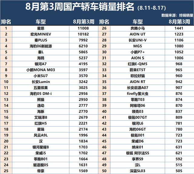 完败!8月第3周国产轿车销量:燃油车无缘前10,秦L第5,逸动第14