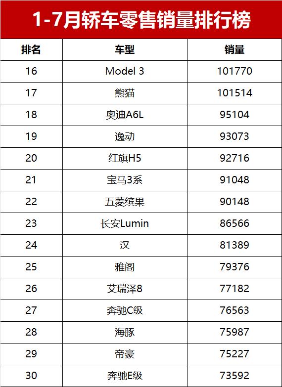 奥迪A6L以95104辆的销量排名第十八,成为豪华中大型车销量冠军。长安逸动以93073辆的销量排名第十九,红旗H5以92716辆的销量排名第二十,是销量最高的国产燃油中型车,力压众多合资品牌中型车。宝马3系、五菱缤果、长安Lumin、比亚迪汉和本田雅阁销量均超过7万辆,分别排名二十一至二十五位。奇瑞艾瑞泽8、奔驰C级、比亚迪海豚、吉利帝豪和奔驰E级销量在7万辆左右,排名二十六至三十位。