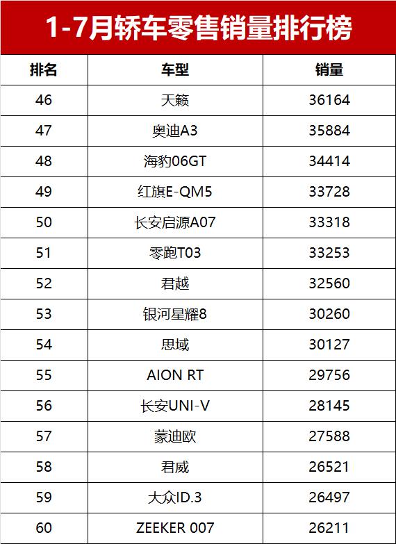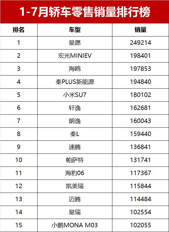 1-7月轿车销量榜完整版!17款车破10万辆,星愿霸榜,轩逸第六