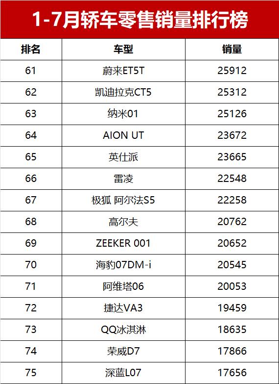 具体来看,今年前七个月累计零售销量超过7万辆(月均销量破万辆)的轿车共有30款车型,其中17款车型累计销量已经超过10万辆。吉利星愿异军突起,以249214辆的销量勇夺轿车销量冠军宝座。曾经的销量榜常客宏光MINIEV以198401辆的成绩位居第二,去年的轿车销冠比亚迪海鸥则以197853辆的销量紧随其后,位列第三。