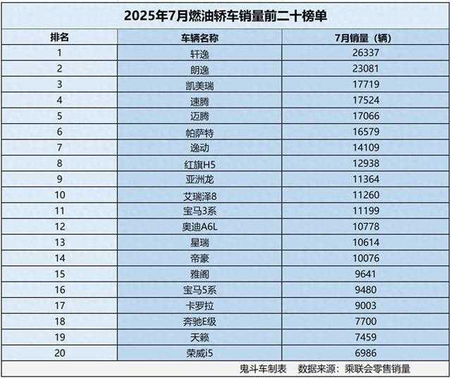 燃油车又火了?7月燃油轿车销量榜单 十四款销量过万 凯美瑞第三