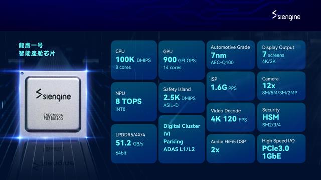 “龍鹰一号”采用7纳米先进制程,具备高性能、高算力、高集成度、低功耗等特性。其高性能算力集群拥有8核CPU、14核GPU,以及8 TOPS 算力的独立NPU;支持高带宽低延迟的LPDDR5内存;配备了双HiFi 5 DSP处理器,集成最高功能安全等级 ASIL-D 的独立安全岛;支持7屏高清画面输出和12路视频信号接入。拥有广泛应用场景和巨大市场潜力,可支持多维度的成熟应用,包括数字仪表盘、HUD、4K高清显示、大型3D游戏、AVM(Around View Monitor全景泊车影像系统)、DMS(Driver Monitoring System驾驶员监测系统)、OMS(Occupancy Monitoring System车内人员监控系统)等,为智能座舱应用提供了全方位的算力支撑。