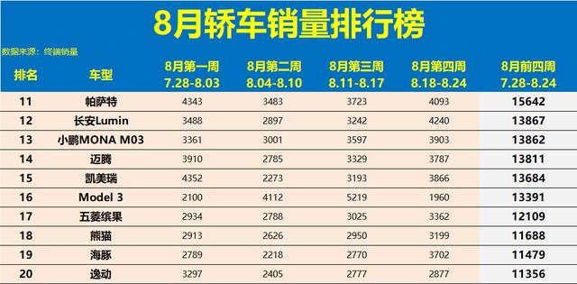 第11至20名中,合资燃油车与国产新能源继续展开拉锯战。帕萨特、迈腾、凯美瑞等老牌中型车虽然销量仍能过万,但已被多款新能源车型超越。小鹏MONA M03作为新车型冲至第13名,表现不俗,也体现出市场对新设计的接受度较高。长安Lumin、五菱缤果等微型电动车继续保持稳定输出,说明该细分市场仍有持续需求。海豚、逸动等车型销量略有回落,但仍保持在中游位置,显示出一定的市场韧性。