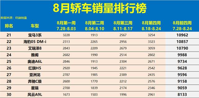 燃油车大败!8月轿车销量排行:23款过万,秦L第6,凯美瑞第15