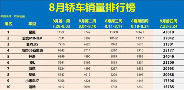 近日获悉,2025年8月前四周轿车销量数据已经出炉,整体市场呈现出较为明显的分层态势。比亚迪旗下多款车型表现强势,秦PLUS、海豹06、秦L等稳居前列,展现出新能源车型的持续热度。传统燃油车如轩逸、朗逸、速腾等虽仍保持一定销量,但增速明显放缓。值得注意的是,小米SU7作为新势力代表冲入前十,表现亮眼,而五菱宏光MINIEV、长安Lumin等微型电动车也保持稳定输出。豪华品牌中,宝马3系、奥迪A6L等依旧占据一席之地,但整体排名中下游。燃油车大败!8月轿车销量排行:23款过万,秦L第6,凯美瑞第15!