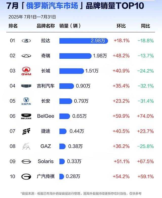 2025年7月,俄罗斯汽车市场前三甲:拉达、奇瑞和长城汽车,销量分别为2.98万辆、1.98万辆以及1.51万辆。拉达作为俄罗斯本土的汽车品牌,有着深厚的市场基础和本土优势排在榜首位置。