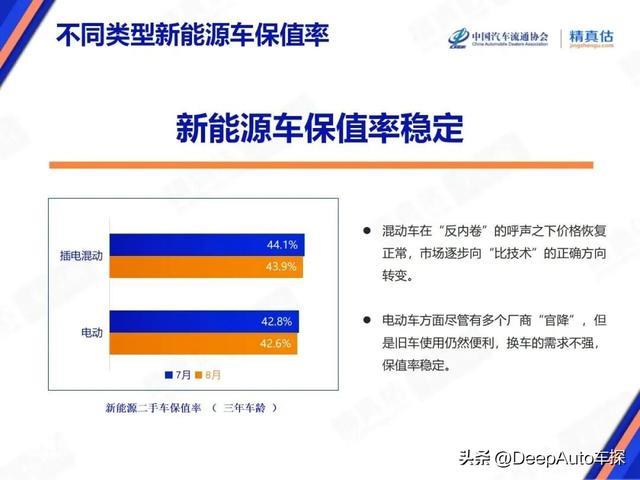 新能源汽车保值率在8月依然面临挑战,插电混动和纯电动车型三年保值率分别为43.9%和42.6%,环比均下滑0.2%,数据相对比较稳定。但这一数据与燃油车50%以上的保值率仍有明显差距,反映出消费者对新能源二手车的信心尚未完全建立。
