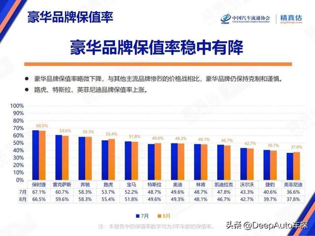 豪华车市场的保值率格局在8月出现明显分化。保时捷以66.5%的三年保值率继续领跑豪华品牌,但环比下滑0.6%;雷克萨斯和奔驰分别以59.6%和58.3%位列第二、三位,其中雷克萨斯环比下滑1.1%,奔驰则保持稳定。这一梯队的表现印证了传统豪华品牌在品牌溢价和工艺品质上的深厚积淀。