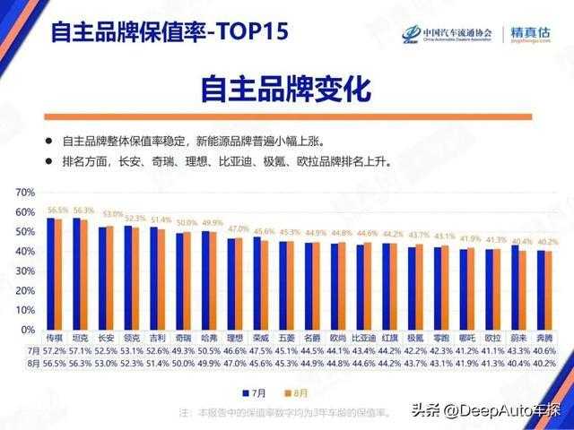 自主品牌保值率在8月延续了上升势头,头部品牌表现尤为突出。传祺以56.5%的三年保值率继续位居自主品牌榜首,虽然环比下滑0.7%,但这一数据已超越大众、现代等主流合资品牌。坦克品牌紧随其后,以56.3%的保值率展现出硬派SUV的市场号召力,长安、领克、吉利则分别以53.0%、52.3%、51.4%构成第二梯队。