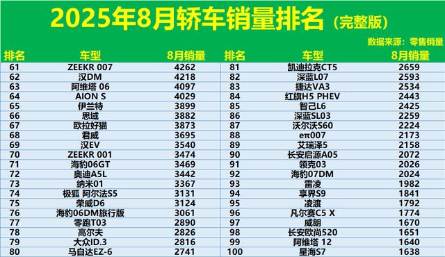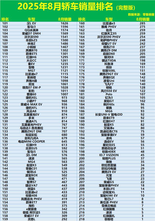 燃油车大败!8月轿车销量排名:1-218名,秦PLUS第4,帕萨特第9!
